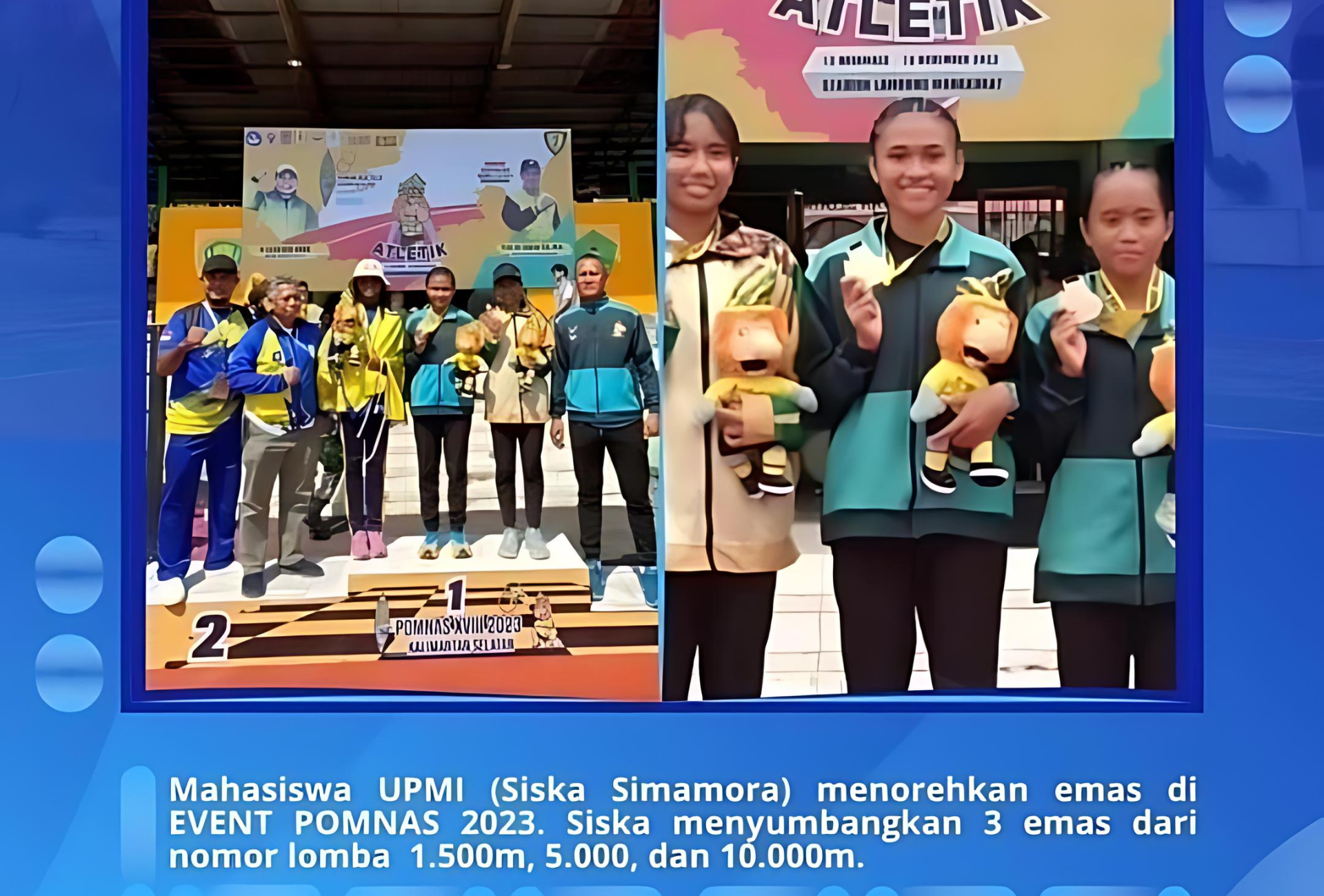 Mahasiswi Universitas Pembinaan Masyarakat Indonesia (UPMI) Medan, Siska Simamora, mencatatkan prestasi luar biasa dalam ajang Pekan Olahraga Mahasiswa Nasional (POMNAS) 2023. Dalam kompetisi yang diikuti oleh atlet mahasiswa dari seluruh Indonesia ini, Siska sukses menyumbangkan tiga medali emas sekaligus. Emas diraihnya dari tiga nomor lomba jarak jauh, yaitu 1500 meter, 5000 meter, dan 10.000 meter. Prestasi ini menjadi kebanggaan tersendiri bagi UPMI, sekaligus mengharumkan nama Sumatera Utara di pentas nasional.