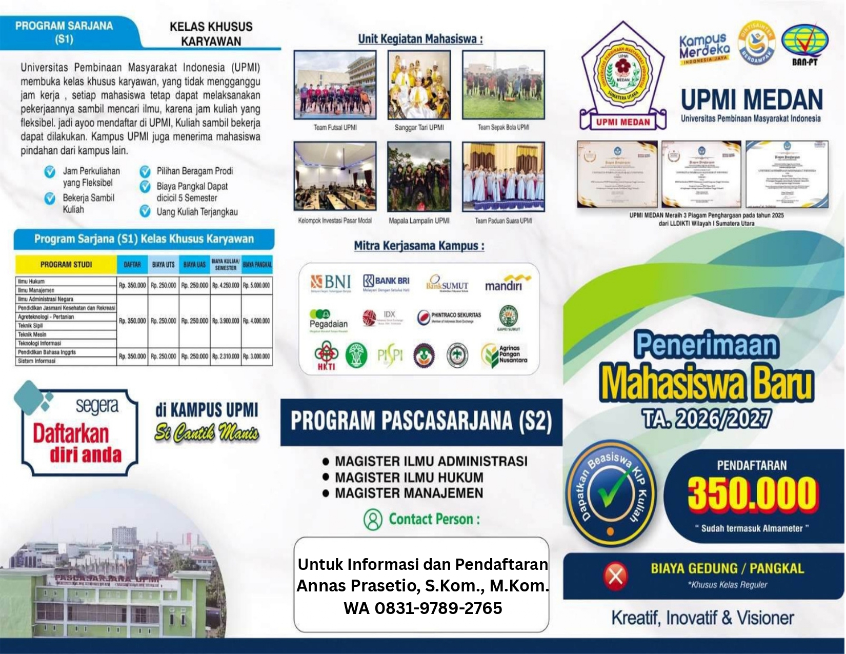 Universitas Pembinaan Masyarakat Indonesia (UPMI) Medan merupakan salah satu perguruan tinggi swasta terkemuka di Sumatera Utara yang berkomitmen mencetak lulusan berkualitas dan berdaya saing global. Sejak berdiri, UPMI secara konsisten mengembangkan pendidikan tinggi yang berorientasi pada penguatan ilmu pengetahuan, teknologi, dan seni.
